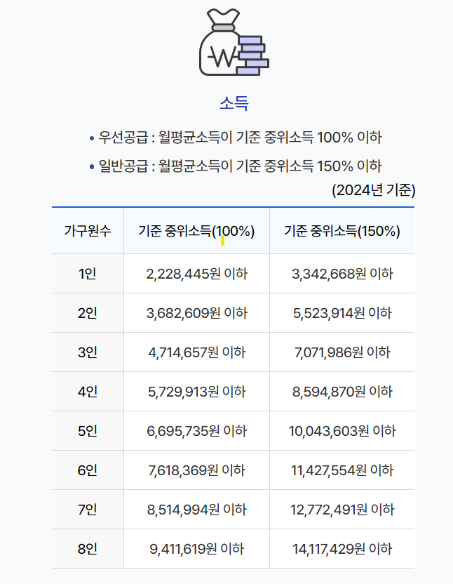 - 소득 기준: 가구 소득이 일정 기준 이하이어야 합니다. 이는 중위소득의 50%에서 100% 사이로 설정됩니다.