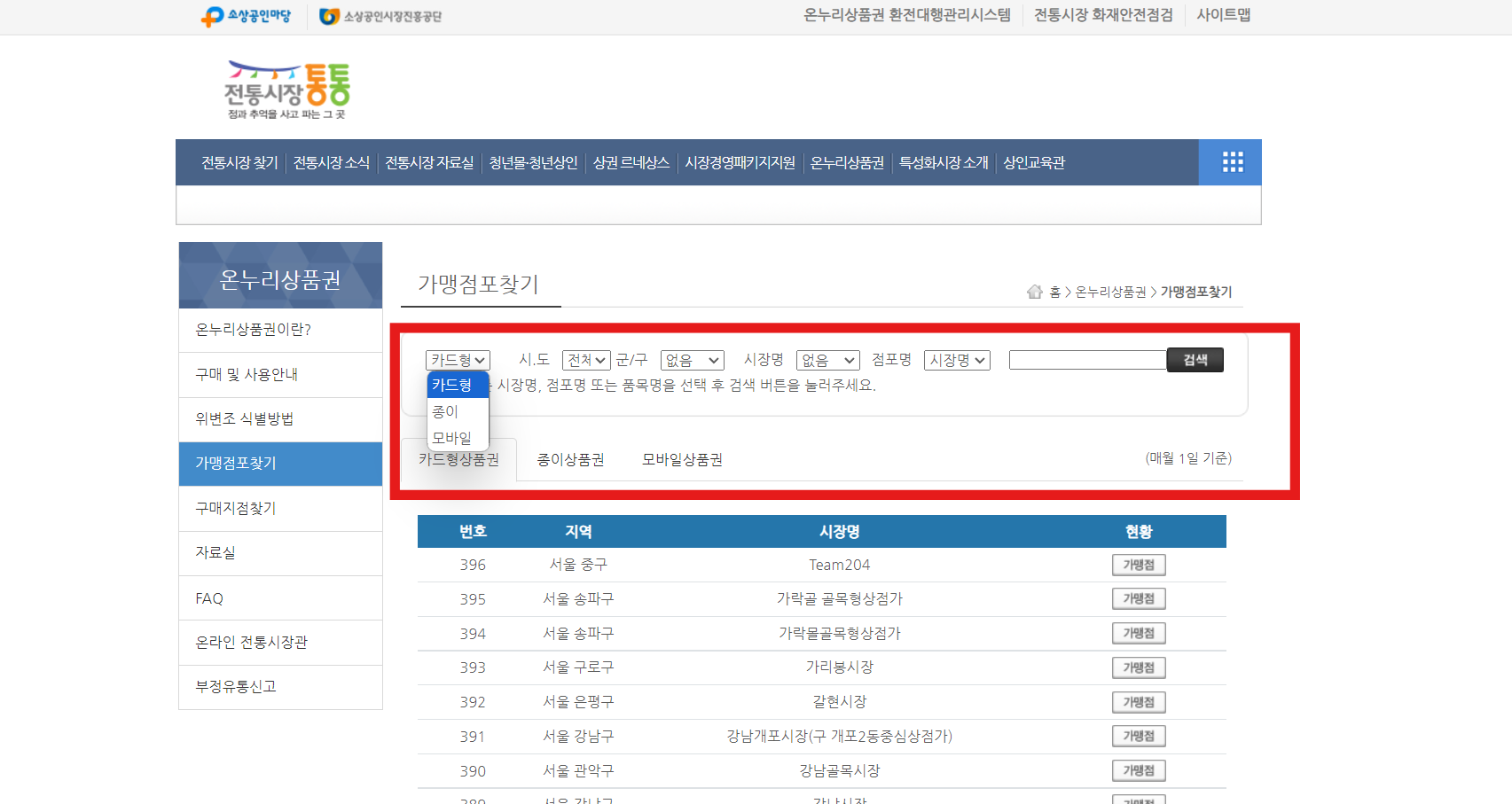 카드형인지 종이, 모바일인지 선택하고난 뒤, 지역, 시장명 등을 선택 또는 입력하면 가맹점 리스트를 볼 수 있습니다.