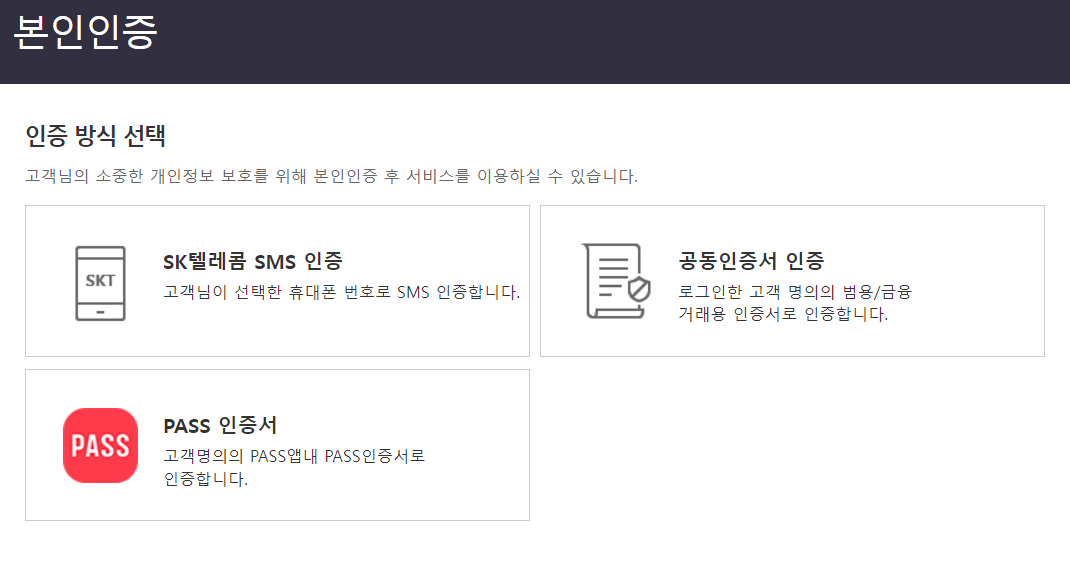 5. 다음의 세 방식 중 하나를 선택하여 본인 인증을 합니다.