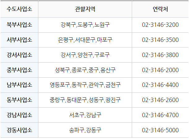 120다산콜센터 또는 관할 수도사업소를 통해서 신청하는 것도 가능합니다. 다음은 서울시 관할 수도 사업소의 연락처입니다. 전화신청하기를 원하신다면, 관할지역 잘 확인하셔서 연락해 보시기 바랍니다.