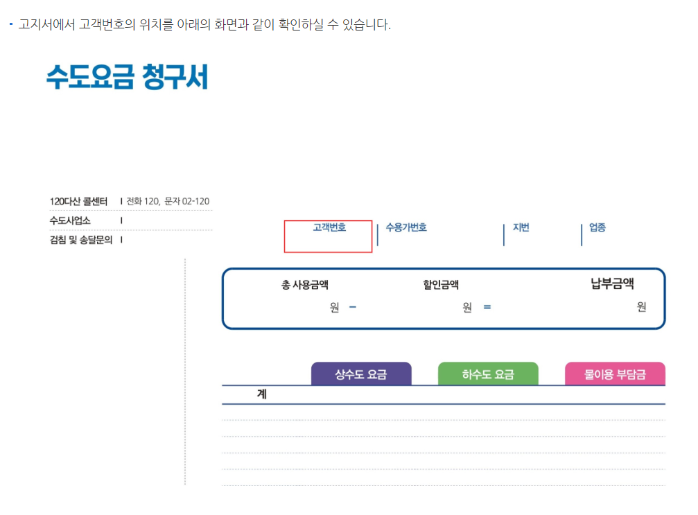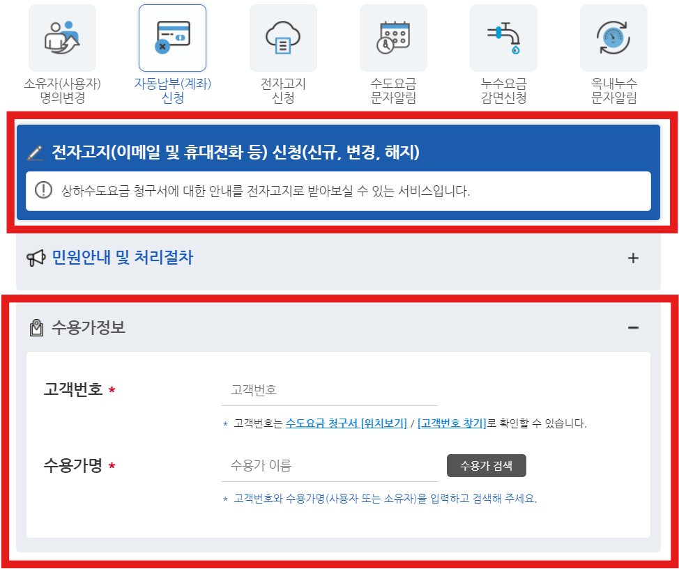 우선, 홈페이지의 자동납부(계좌)신청 화면에서 정보를 입력합니다. 수용가 정보에서 고객번호와 수용가번호는 종이청구서의 가장 앞면에 표기되어 있습니다.