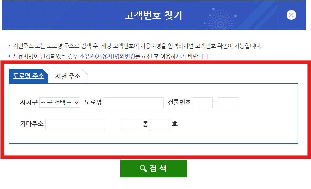 고객번호 분실시, 아래의 화면에서 도로명주소 또는 지번주소를 입력하면, 고객주소를 바로 찾을 수 있습니다.