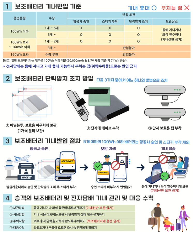 → 기내에서는 보조배터리로 스마트폰 등을 충전하는 행위도 금지됩니다. - 보관 시 단자 보호 필수
