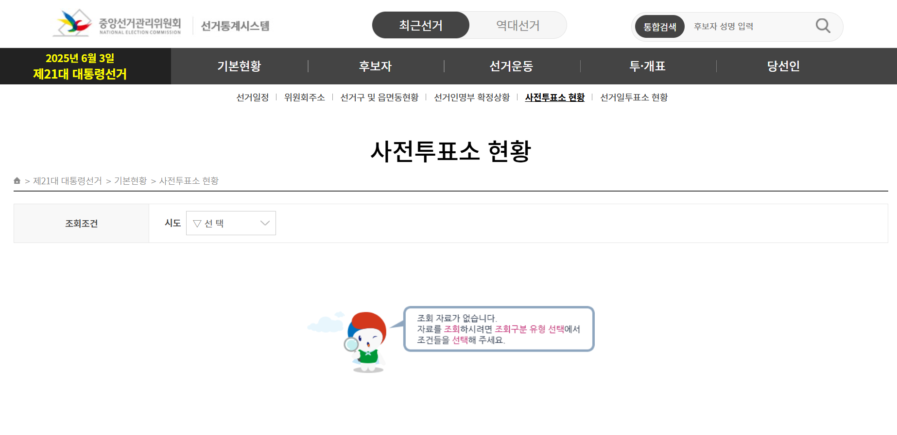 아래와 같은 화면에서 '사전투표소 현황'을 클릭하세요.